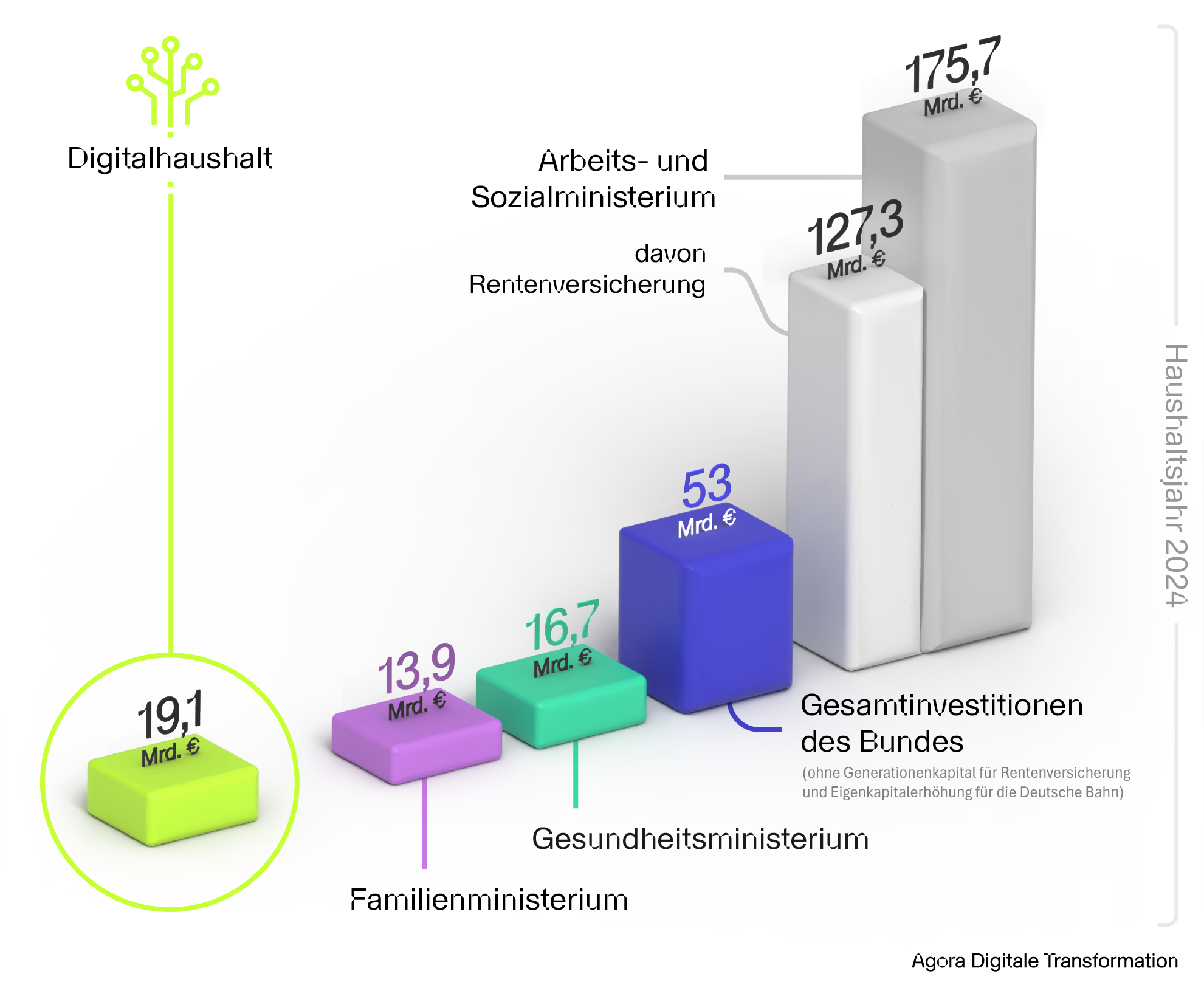 Die Agora Digitale Transformation arbeitet bei der Konzeption und Berechnung des Digitalhaushalts mit einem Forschungsteam am ZEW – Leibniz-Zentrum für Europäische Wirtschaftsforschung um Prof. Dr. Irene Bertschek und Prof. Dr. Friedrich Heinemann zusammen. In die Konzeption des Digitalhaushalts wird Expertise aus Ministerien, Bundestag und digitalpolitischen Organisationen einbezogen. Die Ergebnisse sind im Februar 2025 erschienen (siehe unten unter „Publikationen“). Ein Folgeprojekt läuft bereits und erste Ergebnisse erscheinen im Frühjahr 2026.