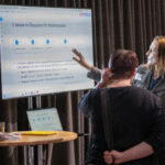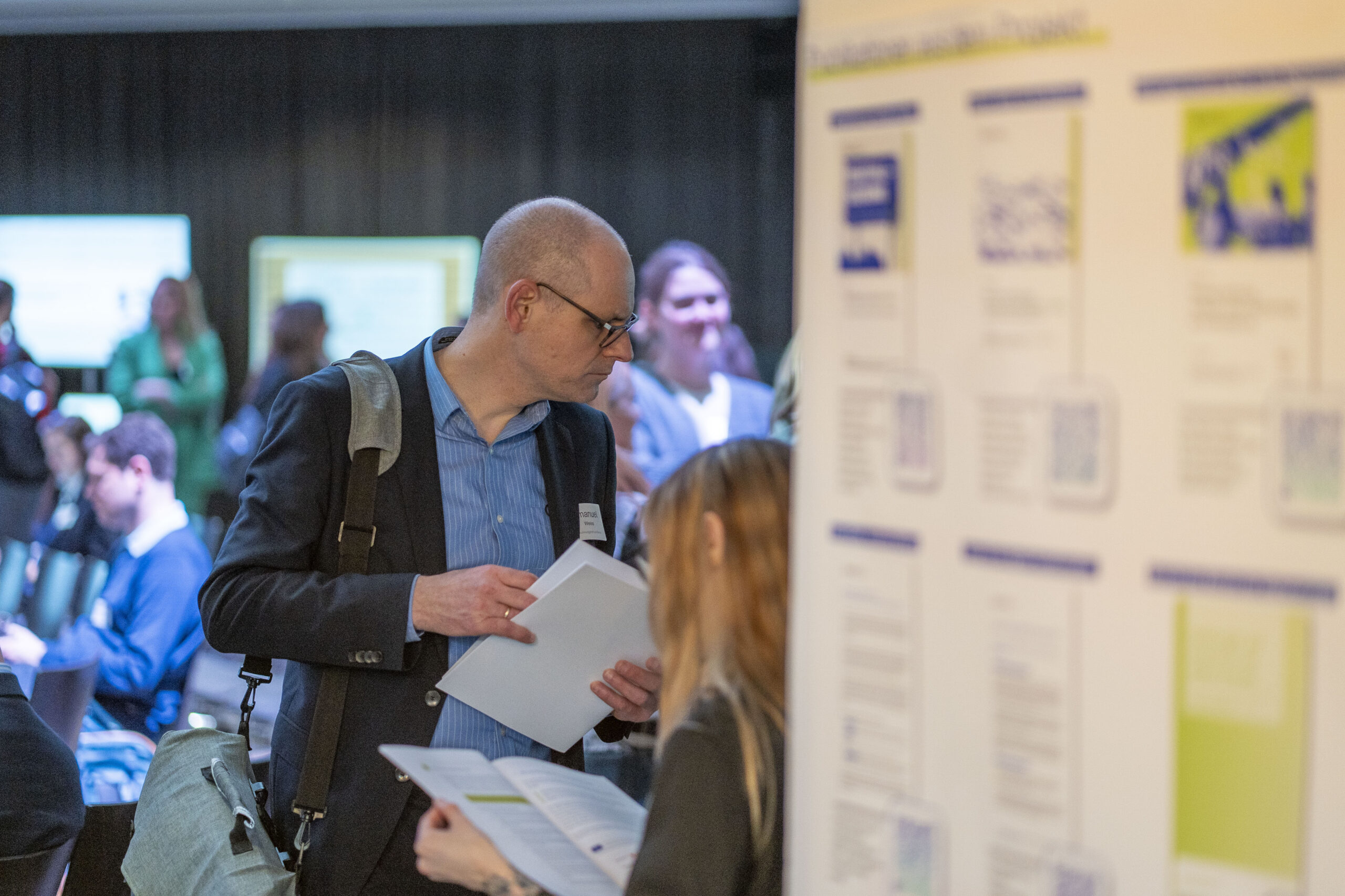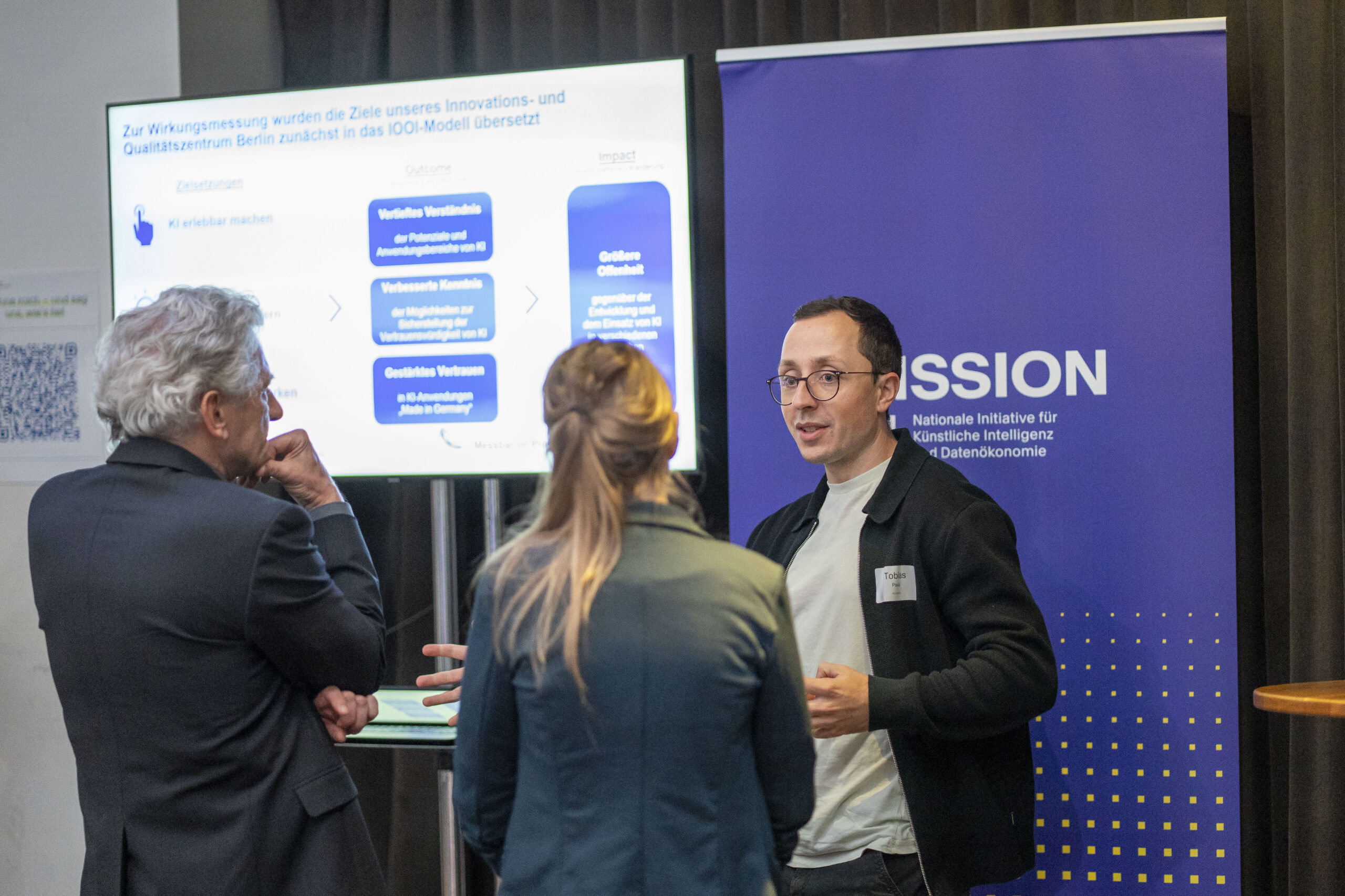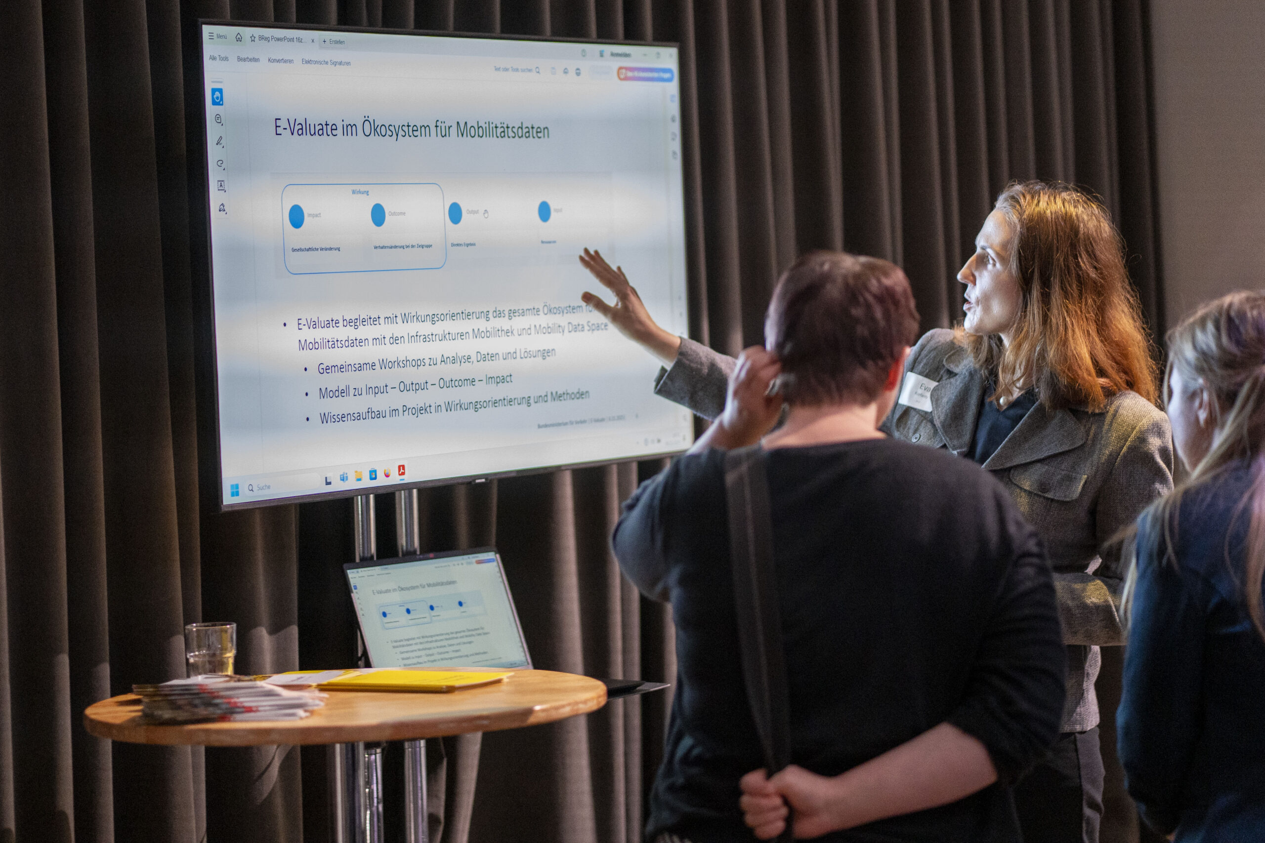 Die Kuppelhalle diente währenddessen auch als Bühne für den Gallery Walk der E-Valuate Pilotprojekte. Sechs Projekt der Digitalstrategie arbeiteten im Rahmen des E-Valuate Projekts praxisnah daran Wirkungsorientierung zu Erlernen und anzuwenden. Die Zusammenarbeit im Projektverlauf stellten sie mit Postern und digitalen Elementen vor. So konnten sich Teilnehmende informieren, Einblicke in Methoden erhalten und nachvollziehen, wie wir mit den Projekten gearbeitet haben – vom ersten Wirkmodell bis zu den Lessons Learned.